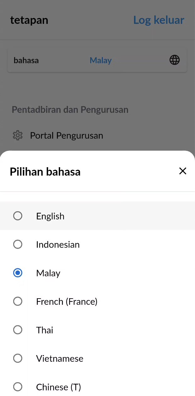 For example, if Malay is selected from the list, the Dashboard screen and other interface elements will be displayed in Malay.