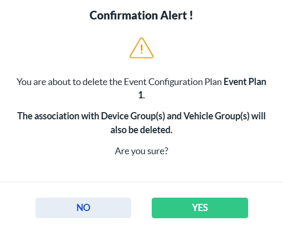 To delete a Event Plan, click the Delete icon in the Actions column. A confirmation dialog will appear. Click Yes to permanently delete the selected Event Plan, or No to cancel the action.