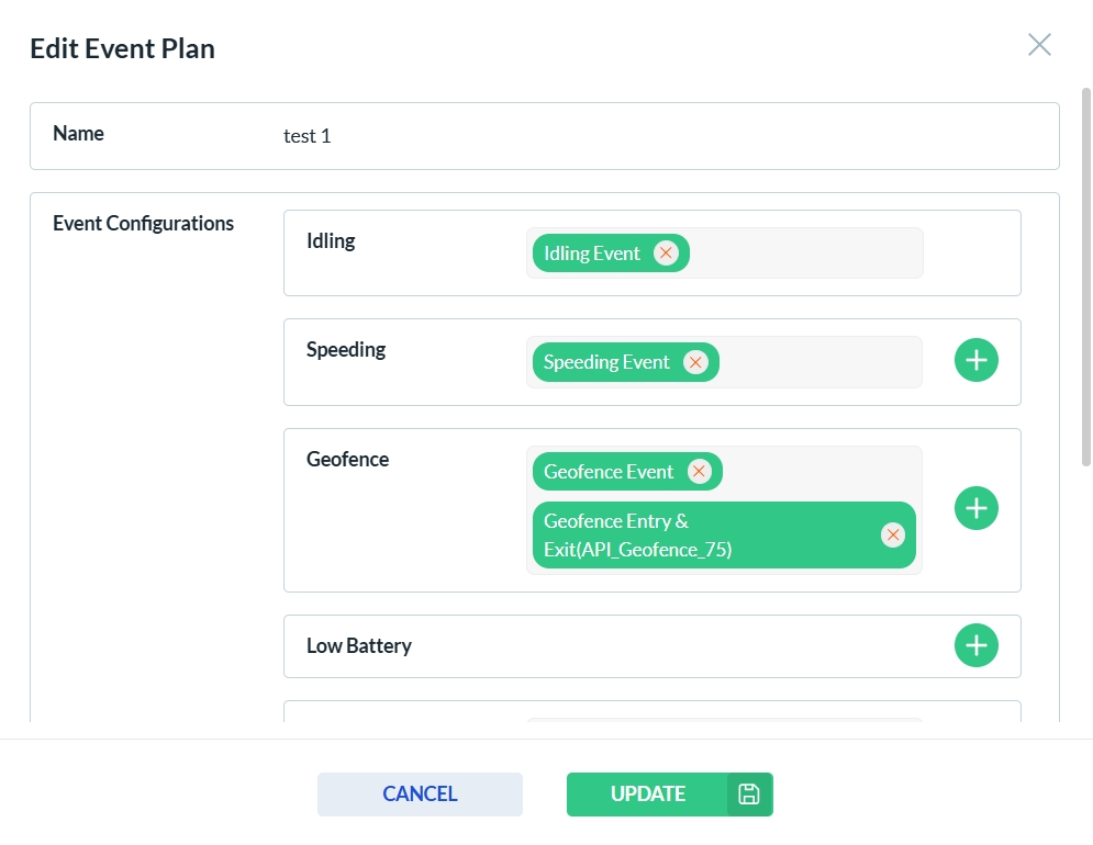 After clicking the edit icon in the Actions column, the Event Plan form opens. Only the fields that are enabled can be edited—disabled fields are read-only. Click Update to save your changes, or Cancel to discard them.